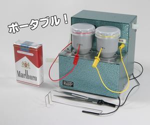 持ち運び簡単。指輪のサイズ直しや、小物部品専用のロジュ―ムメッキ装置です。 約5分でメッキが始められる軽便ツールです。 ●メッキ液(または脱脂液)の入った下部溶液を指で押さえると、上のメッキ槽(または脱脂槽)に液が満たされ、メッキ作業ができます。 ●指をはなすと自動的に下の容器に液が戻ります。 ●たとえ倒れても、下の容器から液が漏れることはありません。 【消費電力】 AC100V-80W 【寸 法】 巾122×奥行125×高さ135?/重量1.6? 【メッキ液容量】 下部容器に35cc 【メッキ電流】 定電流方式 【液温調整】 ウォ―ターバス方式による自動調整 ※メッキ液は別売りです。