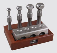 焼入研磨仕上げされた、だ円矢坊主4本と、それに対応するだ円玉台のセット。 4面にだ円玉があります。 【セットの重量】 5.2kg 【木製台の寸法】195×40×145 <だ円玉台の詳細> 【寸法】 150×50×50mm 第1面 穴数5 最小穴サイズ12×9 深さ2 最大穴サイズ15×11.5 深さ4 第2面 穴数4 最小穴サイズ17×13 深さ3 最大穴サイズ20×15 深さ4.5 第3面 穴数4 最小穴サイズ23×17 深さ4 最大穴サイズ26×19 深さ5.5 第4面 穴数3 最小穴サイズ27×20 深さ4.5 最大穴サイズ30×22 深さ6 <だ円矢坊主の詳細> 長さ135mm 1 先端の直径18ミリ、だ円部サイズ9×6 2 先端の直径26ミリ、だ円部サイズ13×8 3 先端の直径34ミリ、だ円部サイズ17×10 4 先端の直径41ミリ、だ円部サイズ20.5×12.5