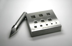 17°正方形、 焼入研磨仕上げ。 1辺の長さ 4mm、5mm、6mm、7mm、8mm、 9mm、10mm、11mm、12mm、13mm、14mm の11穴 【寸法】 100×90×高さ25mm/1.9kg