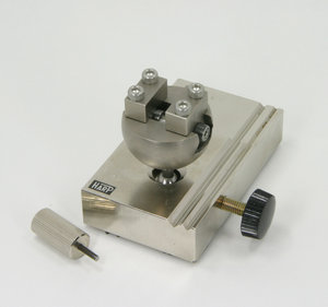 【寸法】工作台の長さ73mm 工作台の巾44mm、高さ16mm V溝の角度:90度 深さ:0.8mm及び1.5mm 端から25mmにフライス加工で1mm切削 口金の巾16mm、掴み深さ8mm 口金の最大開き巾17mm 【バイス部の傾斜角度】約63度 【重量】約460g 【付属品】ツマミ、丸爪着脱用L字スパナ